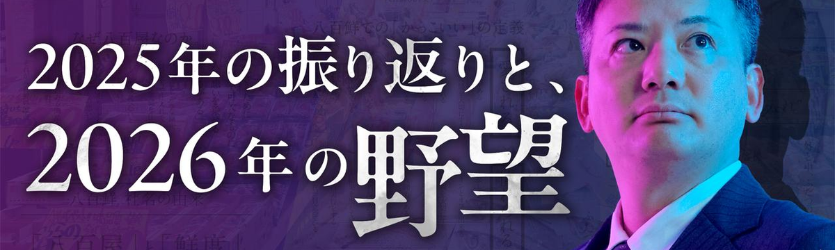 株式会社八百鮮 3 days ago Follow 市原 敬久 2025年の振り返りと、2026年の野望 新年明けましておめでとうございます。社長の市原です。八百鮮を今年もよろしくお願いします。2025年を振り返ってみると、堅実な1年だったなという感じです。八百鮮は創業から15年で10店舗を展開し、... Read more