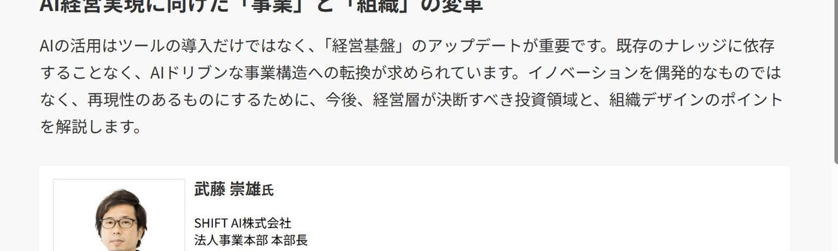 崇雄 武藤 20 days ago Follow AI & DX Leaders’ Conference 2026 人・組織・事業の再定義とビジネス戦略再考 イベント名:AI & DX Leaders’ Conference 2026 人・組織・事業の再定義とビジネス戦略再考開催日時 :2026年3月17日(火)13:00~19:30(予定)会場 ... Read more