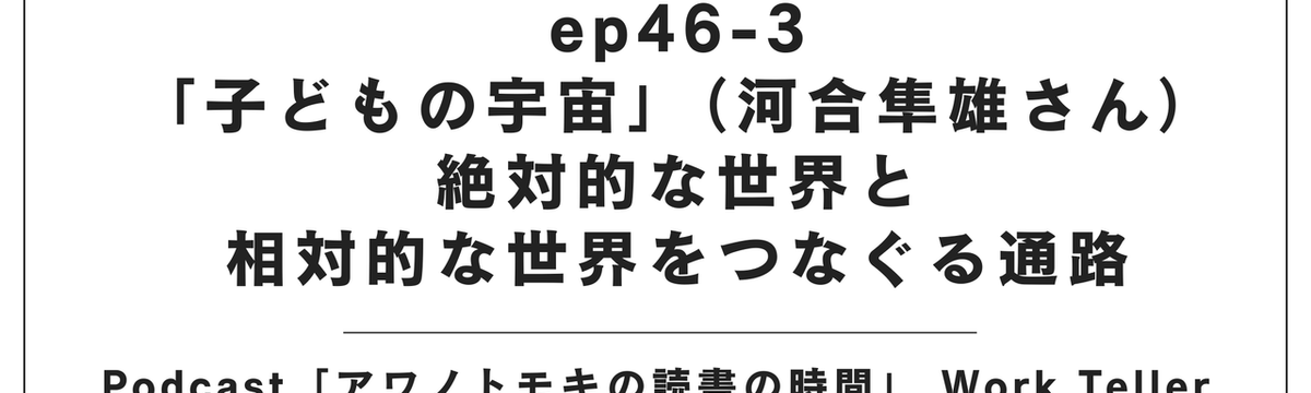 Tomoki Awano 3 days ago Follow Podcast「アワノトモキの読書の時間」 Work Teller ep46-3「子どもの宇宙」(河合隼雄さん)/... 今回取り上げるのは、河合隼雄さんの『子どもの宇宙』(岩波書店)。子どもの内面には、言葉にしきれない“絶対的な世界”が広がっています。一方で、大人は評価や比較が支配する“相対的な世界”を基準にしが... Read more