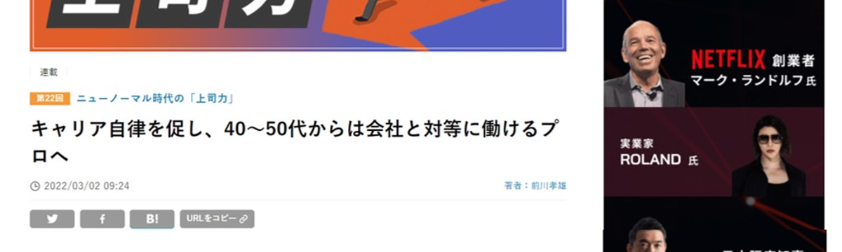 株式会社FeelWorks over 3 years ago Follow 前川 孝雄 これからの時代は、寄らば大樹ではなく、40歳くらいには、会社と対等に渡り合えるプロに成長することを目指すべきです。 ■キャリア自律を促し、40〜50代からは会社と対等に働けるプロへ@マイナビニュース連載22マイナビニュースさんでの連載22回目が3/2に公開されました。これからの時代は寄らば大樹では、会社に生殺... Read more