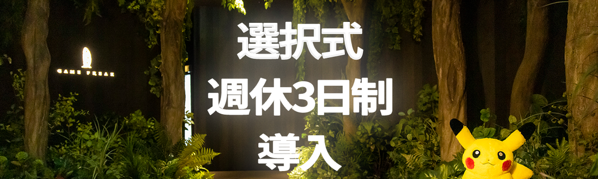 株式会社ゲームフリーク over 3 years ago Follow 採用担当 選択式週休3日制、導入! 2022年4月より、『選択式週休3日制』を導入しました。「育児・介護・看護」を目的として希望する社員が、土・日曜日に加えて1週あたり1日の休暇を追加取得できる制度です。対象は小学生以下の子を養育... Read more