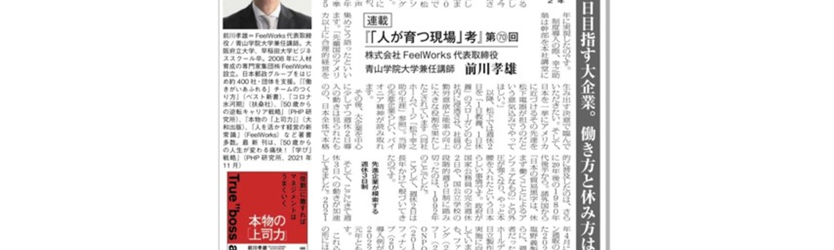 株式会社FeelWorks over 3 years ago Follow 前川 孝雄 週休3日目指す大企業。働き方と休み方はどう変わる?★任せた仕事の当時者である社員一人ひとりが自己裁量で働きがいをも... ■週休3日目指す大企業。働き方と休み方はどう変わる?@通信文化新報『「人が育つ現場」考』70通信文化新報さんでの連載『「人が育つ現場」考』70回目の論考コラムが5/30発行紙に掲載されました。今... Read more