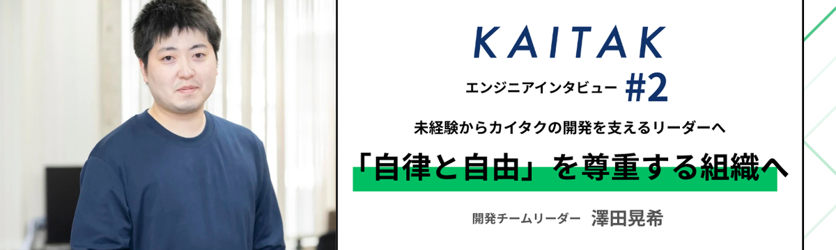 カイタクエンジニアブログ 9 days ago Follow カイタク 採用担当 and 1 others 【エンジニア紹介#2】未経験からカイタクの開発を支えるリーダーへ───「自律と自由」を尊重する組織 カイタクの働き方や価値観を、最前線で活躍するメンバーの言葉で伝えるインタビューシリーズ。今回は、エンジニア未経験でSNSからカイタクに出会い、現在では開発チームのリーダーとして活躍されている澤田... Read more