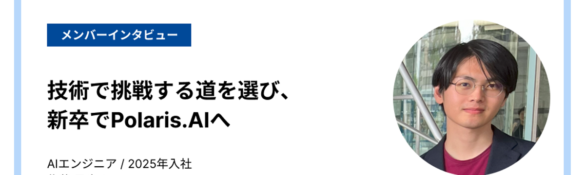 Polaris.AI株式会社 3 months ago Follow Yuu Tadokoro and 1 others 技術で挑戦する道を選び、新卒でPolaris.AIへ(メンバーインタビュー 【1/2】) 2025年4月にAIエンジニアとして入社された佐藤昂也さんに、インタビューを実施。学生インターンから本格的にジョインするに至った背景や、スタートアップを選んだ理由、入社後の率直な感想について伺い... Read more