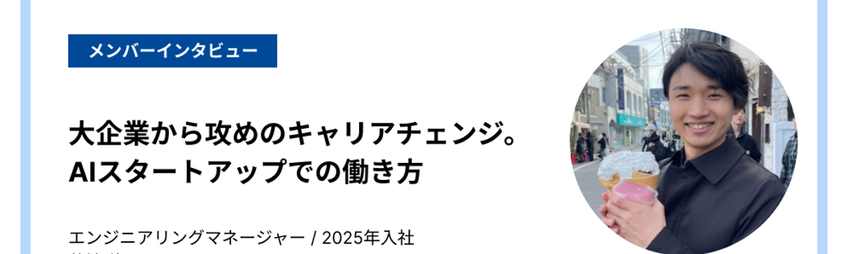 Polaris.AI株式会社 27 days ago Follow Yuu Tadokoro and 1 others 大企業から攻めのキャリアチェンジ。AIスタートアップでの働き方 大企業からベンチャーへ――。安定した環境を離れ、新しい挑戦の場としてPolaris.AIを選んだ菊地さん。エンジニアリングマネージャーとして新たな一歩を踏み出した今の想いを伺いました。【プロフィ... Read more