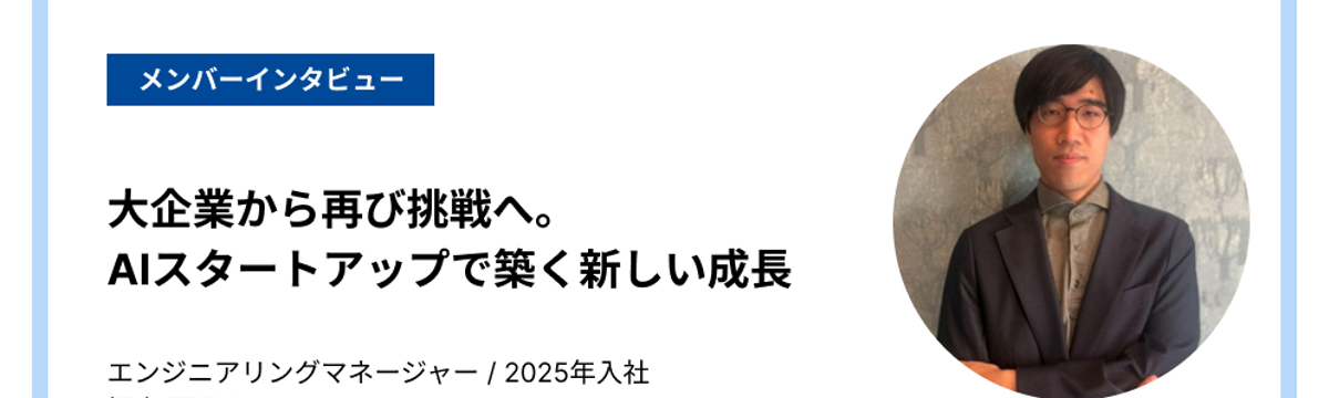 Polaris.AI株式会社 about 1 month ago Follow Yuu Tadokoro and 1 others 大企業から再び挑戦へ。AIスタートアップで築く新しい成長 博士課程で理論物理を研究し、大手ITサービス関連会社でキャリアを積んだ坂本さん。安定した環境から一転、2025年7月にPolaris.AIへ。エンジニアリングマネージャーとして、多様なメンバーと... Read more