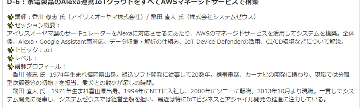株式会社システムゼウス about 5 years ago Follow Naoto Tobita AWS Dev Day に登壇 10/21(水)13:50 今年度のAWS Dev Dayに弊社が登壇します。日時は「10/21(水) 13:50-14:20 Track D」で、タイトルは「家電製品のAlexa連携IoTクラウドをすべてAWSマネージド... Read more