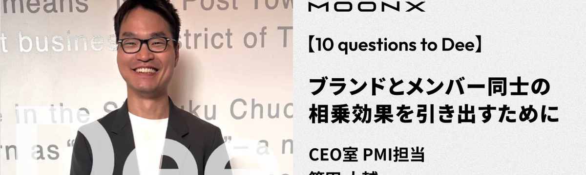 MOON-X Member Interview about 2 years ago Follow Mai Kusunoki and 1 others 【MX社員インタビュー】"共創型M&A"で、自分に関係する人の幸せを最大化したい 今回の「10 questions to 〇〇」コーナーの対象者は、CEO室 PMI担当のDee(篠田)!M&AのディールやPMI業務にご興味のある方やMOON-X内のカルチャーをもっと知りたい!... Read more