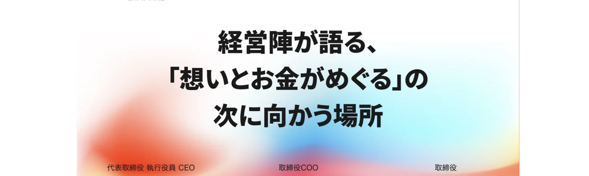 CAMPFIRE about 2 years ago Follow recruit CAMPFIRE and 1 others CAMPFIRE、CFO交代の舞台裏 こんにちは、CAMPFIREでCEOをしている中島真です。 先日、10月1日付で経営体制の変更のお知らせを行いました。はじめに:背景と狙い本タイミングで、これまで2年間CFOを担ってきた大濵順さ... Read more