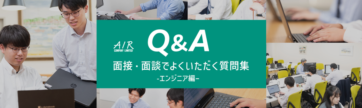 株式会社エアー about 1 month ago Follow AIR 企画担当 【Q&A】面接・面談でよくいただく質問集 ーエンジニア編ー こんにちは、株式会社エアー採用チームです。今回はエンジニア採用の際、面接・面談の中でみなさまからよくいただくご質問をまとめました。組織の風土や働き方、入社後のキャリア、気になる採用のことまで、2... Read more