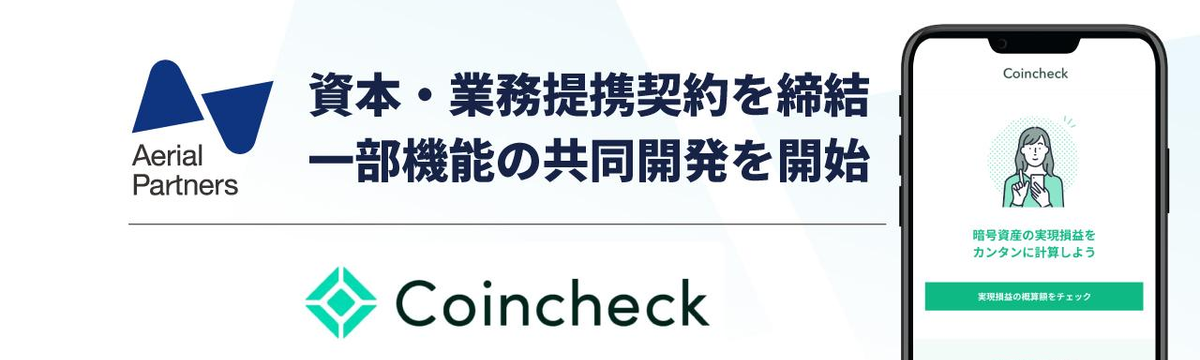 株式会社Aerial Partners almost 2 years ago Follow bb aa and 3 others エアリアルパートナーズ、コインチェックとの資本・業務提携契約の締結と、一部機能の共同開発を発表 こんにちは!エアリアルパートナーズ(株式会社Aerial Partners)広報担当です。2023年12月19日、エアリアルパートナーズはコインチェックとの資本・業務提携の契約締結と、取引サービ... Read more