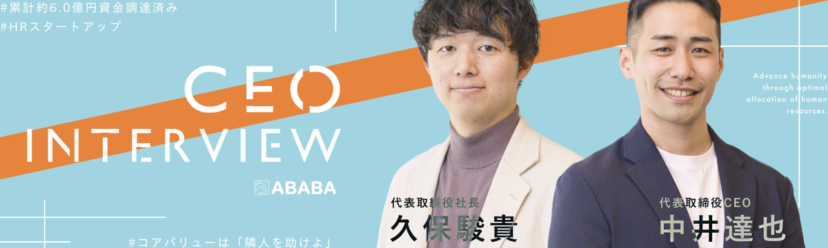 メンバーを知る over 1 year ago Follow ABABA 採用担当 and 2 others 目標は3年以内に業界No.1になること。「若者の就活」に潜む社会課題にHRテックで挑む【代表対談インタビュー】 就職活動の選考プロセスが評価される社会の実現を目指す「ABABA」。リリースからわずか3年で1,200社を超える企業に導入。直近でも累計5.7億円のシリーズAの資金調達を完了し、就活生ユーザーは... Read more