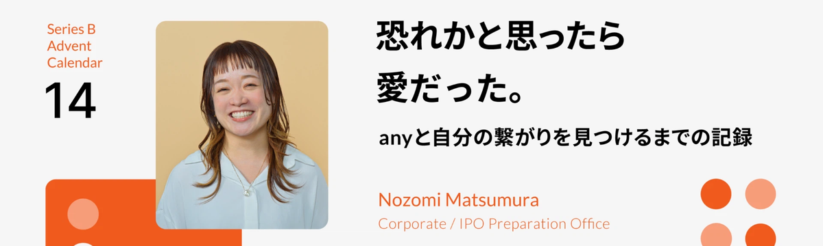 any株式会社 10 months ago Follow any 採用 and 1 others [any的アドカレ📆14日目]恐れかと思ったら愛だった。- anyと自分の繋がりを見つけるまでの記録 - IPO準備室への異動から始まった挑戦の日々。その裏側には、anyらしい“フィードフォワード”や仲間の支え、そして愛と確信がありました。挑戦の先にある「HAPPY」に触れるブログをぜひチェックして... Read more