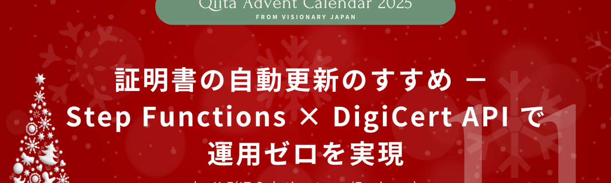 Qiita Advent Calendar 2025 10 days ago Follow VISIONARY JAPAN 採用広報 【Advent Calendar 2025 #11】証明書の自動更新のすすめ − Step Functions ×... 🎄はじめに🗓️Qiita Advent Calendar 2025とは?📗12月11日(木)の記事のご紹介📝昨年までのアドベントカレンダー2024年2023年🎁おわりに🎄はじめにこんにちは!VI... Read more