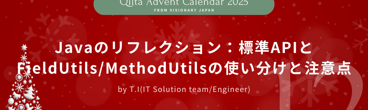 Qiita Advent Calendar 2025 9 days ago Follow VISIONARY JAPAN 採用広報 【Advent Calendar 2025 #12】Javaのリフレクション:標準APIとFieldUtils/M... 🎄はじめにこんにちは!VISIONARY JAPANの採用広報です✨VISIONARY JAPANではエンジニアの技術力向上のため、インプット/アウトプットの場として勉強会や技術交流会の実施、Q... Read more