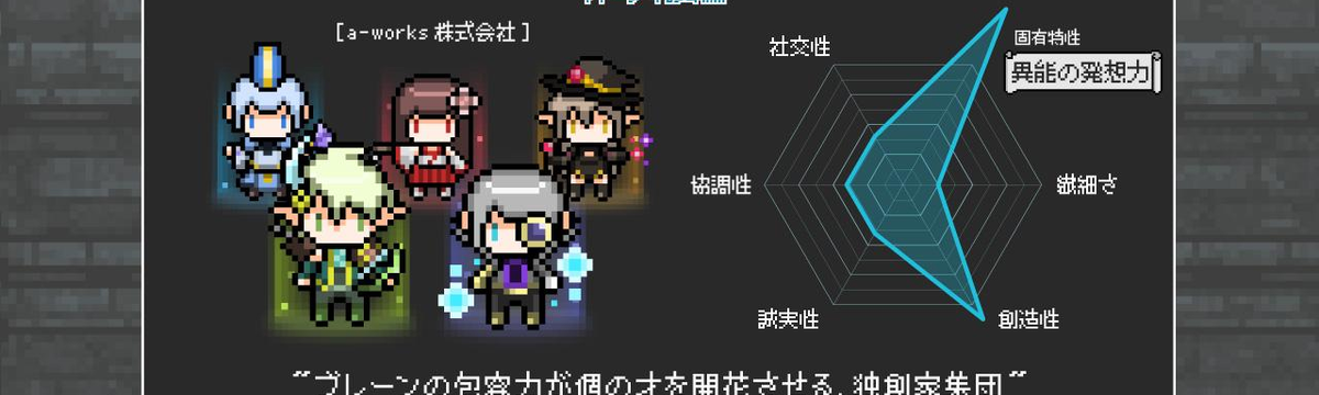 a-works株式会社 over 2 years ago Follow 萌 山口 【RPGパーティ診断】a-worksの分析記事を書いていただきました! こんにちは!a-works 人事部の山口です。話題の「新・RPGジョブ診断」を社内メンバーに受診してもらい、Wantedlyさんに「パーティ診断」結果をまとめていただきました。診断の結果・・・a... Read more