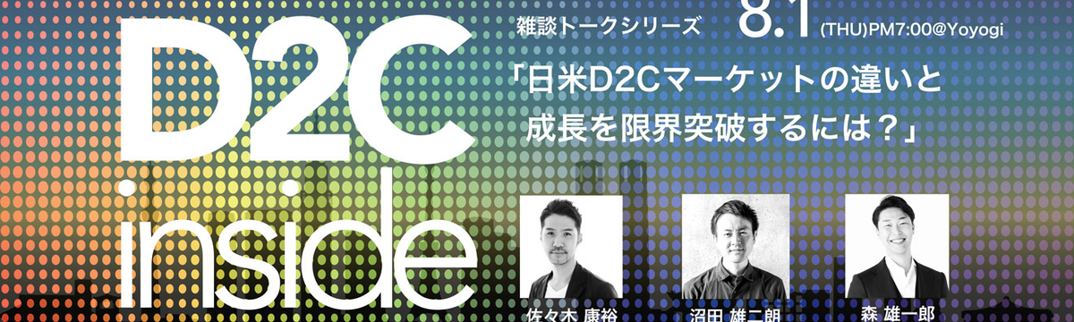 イベント登壇レポート👀 about 6 years ago Follow Masahiro Takahashi and 1 others 小売・IT業界において注目を集めるビジネス・ブランド戦略「D2C(Direct to Consumer)」を語り尽... 広報担当の高橋です!今日は、D2C(Direct-to-Consumer)に興味のある方向けにニュースを一つ!8月1日(木)に、D2Cに関するトークイベントとミートアップを開催することが決定いた... Read more