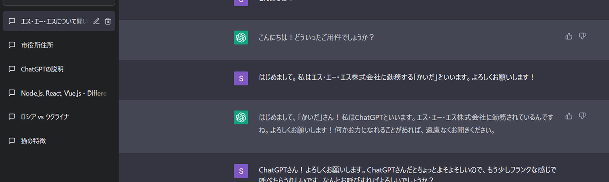 SAS Tech Blog over 2 years ago Follow Makifumi Kaida AIチャット「ChatGPT」で「エス・エー・エス株式会社」のことを聞いてみた こんにちは!エス・エー・エス株式会社DXサービス部の海田(かいだ)です。最近世間を賑わせているAIチャットアプリ「ChatGPT」簡単に利用できたり、会話のレベルが高いなどはともかく、なにより日... Read more