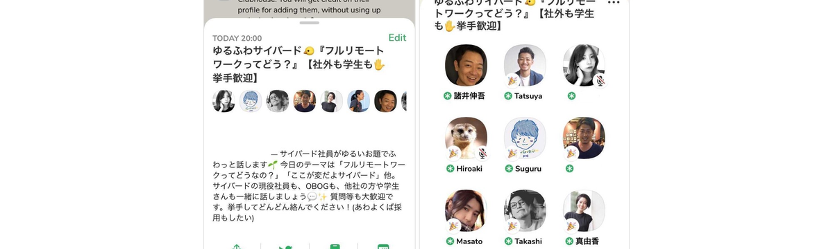 株式会社サイバード over 4 years ago Follow Mayuka Kawajiri 話題の「Clubhouse」でゆるく集まってみた。 社内でも話題となっていた「Clubhouse」!Slackのオープンチャンネルで社内へ呼びかけ、roomを作ってみました。題して、ゆるふわサイバード「フルリモートワーク」ってどう?【社外も学生も... Read more