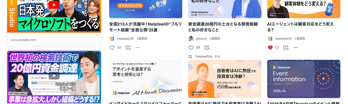 株式会社Helpfeel about 1 month ago Follow Helpfeel 採用担当 Helpfeelのnote、ご存知ですか? こんにちは、Helpfeel(ヘルプフィール)採用チームです!弊社では昨年よりnoteの運用を開始し、社内の様子をお伝えしています。最近は、カジュアル面談などでも「note読みました!」と言って... Read more