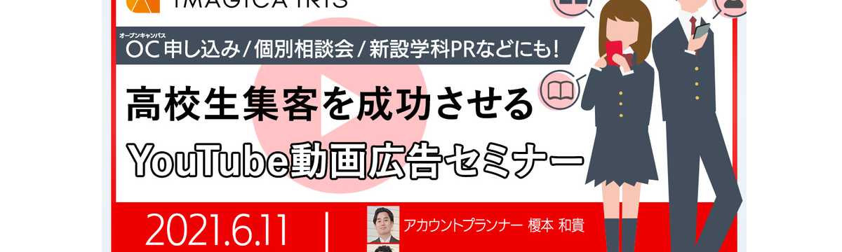 株式会社IMAGICA IRIS over 4 years ago Follow Sasaki and 2 others 【WEBセミナーを開催いたしました】OC申し込み/個別相談会/新設学科PRなどにも! 高校生集客を成功させるYou... 「OC申し込み/個別相談会/新設学科PRなどにも! 高校生集客を成功させるYouTube動画広告戦略」これまで高校生に向けた施策で数多くの動画を制作されてきた学校関係者様へ向けた、 WEBセミナ... Read more