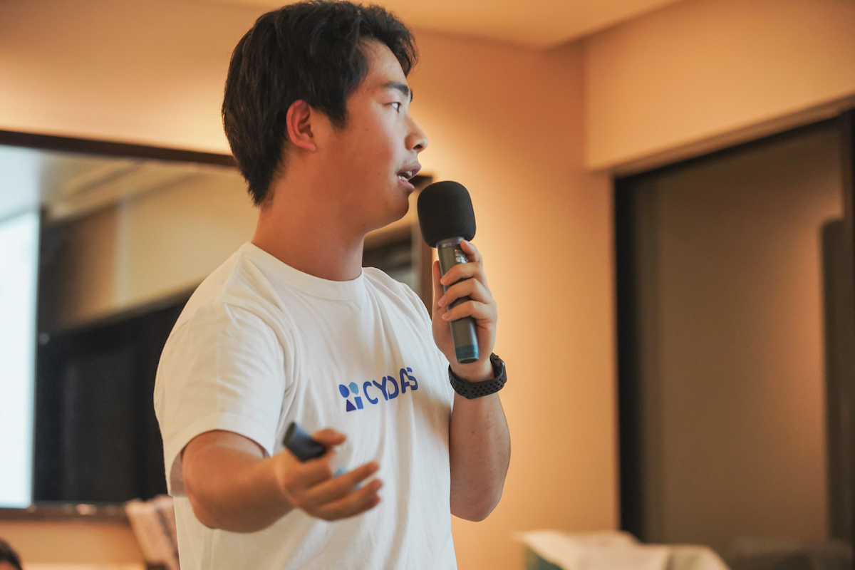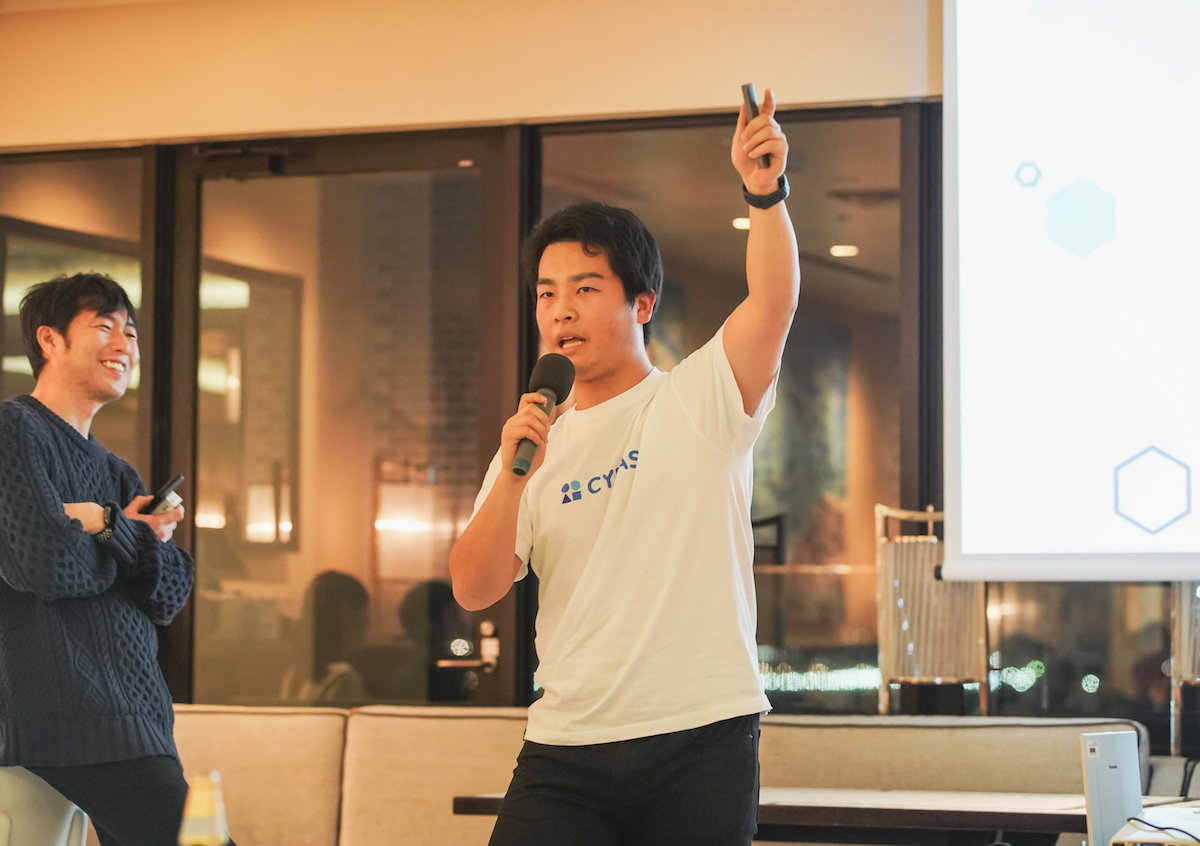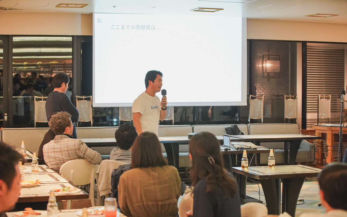 それともう1つ。さっきカズトが言ってたけど、人が増えたよね。これから会社も大きくなっていきます。いい会社にしていきましょう。開発のこととか、色んな細かいことがあって心配なこともあると思います。でも、そんな目先のことは、全部僕がやります。皆さんは、そのもっとずっと先のことを考えていってください。未来のことを考えてください。極端に言えば、僕たちは世界一になれる。世界一の会社で働いてるって言いたくない?言いたいよね!みんなで世界一いい会社で働いてるって言えるように、未来を作っていきましょう。本当に今年1年、お疲れ様!」