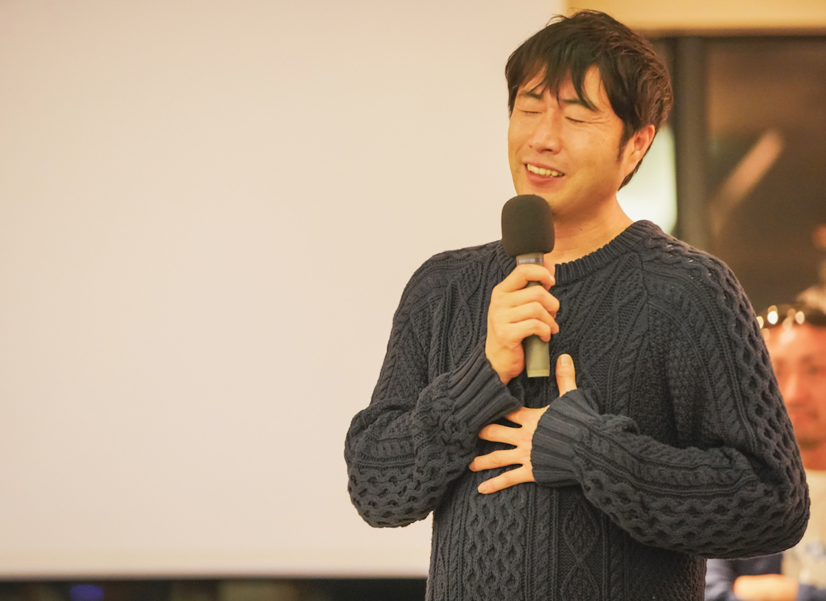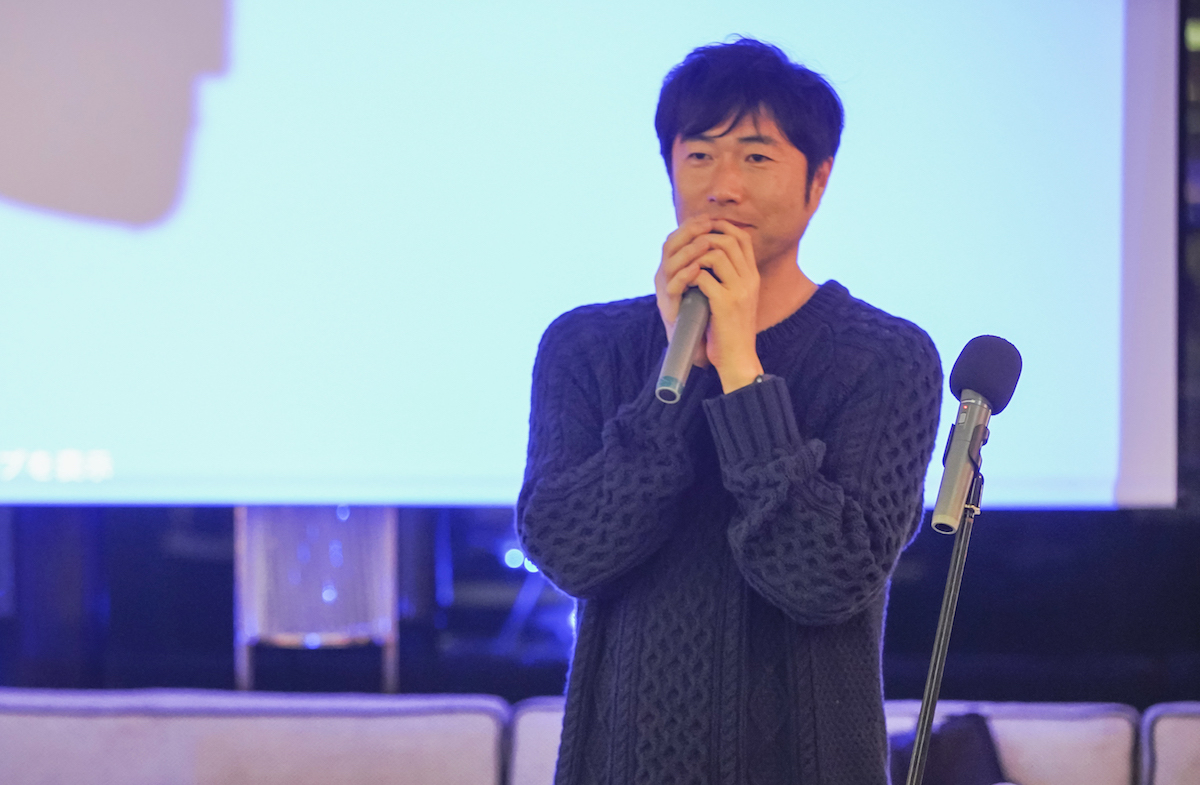 様々なプログラムで大いに笑って泣いた忘年会も、いよいよ終わりの時間が近づいてきました。楽しすぎて、時間があっという間です。締めの挨拶として、まずは営業部カズトさんから一言。