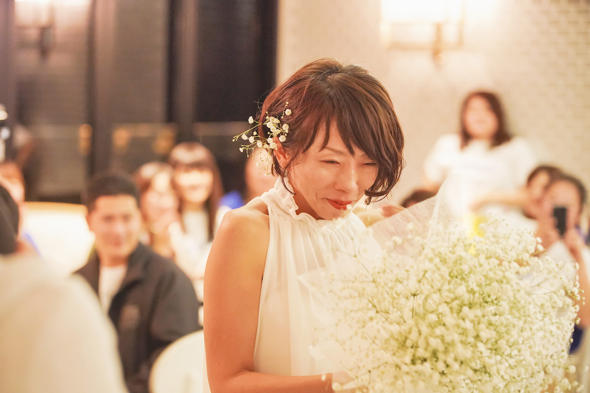 まるでお父さんのような表情の松田さんと腕を組み、登場する富橋さん。いつもはシンプルでナチュラルなイメージがある富橋さんですが、この時だけはしっかり花嫁姿です。かすみ草の花束と髪飾りがとてもよく似合っています。目元にはずっと涙が・・・!会場も一瞬でお祝いムードに変わりました。