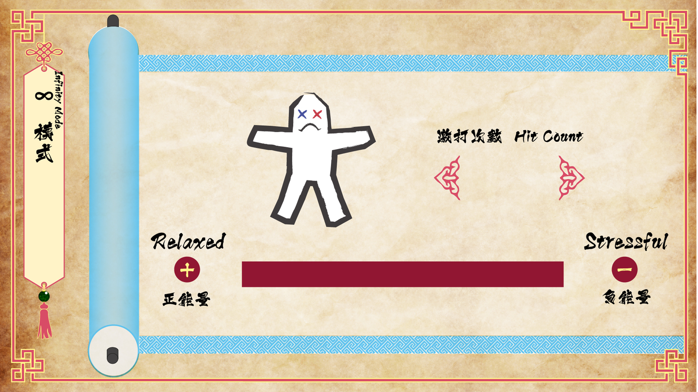 インフィニティモードのUIでございます、たたくたびヒットカウントに数字がプラスされ、下のバーは右から左へためます。負のエネルギーをポジティブの力に変わっていくイメージをしております。