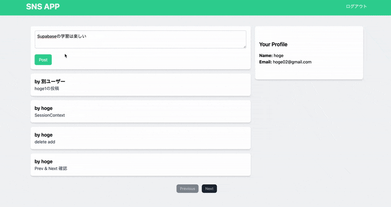 また、投稿はログイン済みユーザーであれば誰でも可能ですが、削除はその投稿を行った本人のみが行えるように、Supabase側でポリシーを設定する方法も学びました。