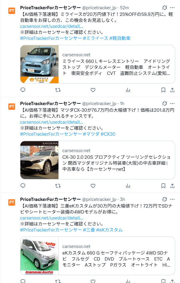 AIがツイートする!?「PriceTracker For カーセンサー」のTwitterアカウントを開設しました!