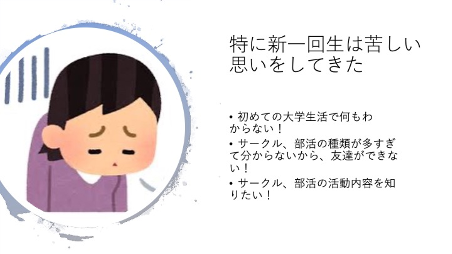 当時、大学の授業や新入生歓迎会はすべてオンライン化され、キャンパスへの立ち入りも制限されていました。 特に新1回生は、先輩や友人との対面での繋がりを持てず、「大学からの公式情報が見つけにくい」「履修登録の方法すら相談できない」という深刻な情報格差と孤立に直面していました。