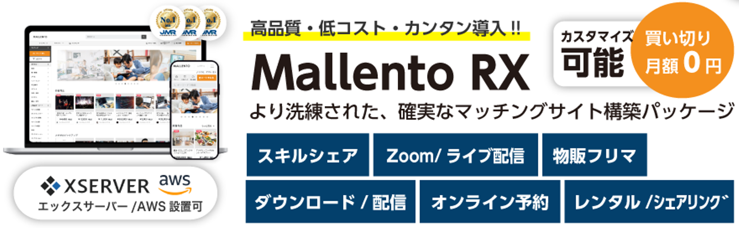 Mallento(マレント)ならCtoC型Webサービス構築からECサイト構築・シェアリングエコノミーサービス、マッチングサイト構築、メルカリのようなフリマサイト構築、動画配信システム、投げ銭機能付きライブ配信システム、iOS/Androidアプリ開発まで驚くほど格安・低価格で導入できます。