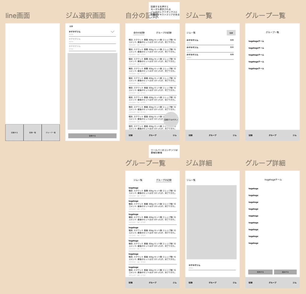 コンセプトからどういった機能・遷移が必要かは洗い出せたので、調査を元に簡易的なワイヤーフレームを作成しました。