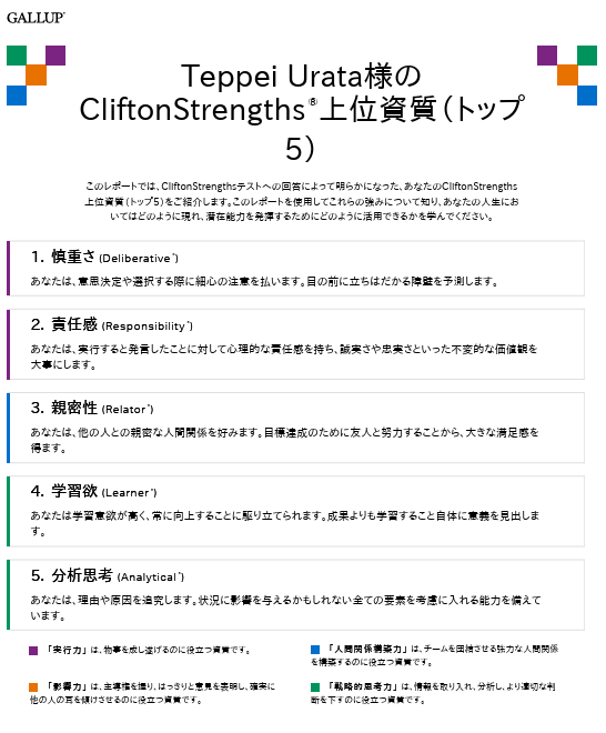 皆さんも「ストレングス・ファインダー」を実施し、自身の強みを知り、活かし、生活や仕事に活かしてきましょう!