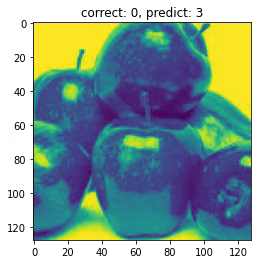 plt.title('correct: {}, predict: {}'.format(flst[1], flst[2]))本来、この画像の正解は「りんご」なのですがAIが出した答えは「さくらんぼ」となっていますね。これは不正解データとして表示されました。そして正解データは無かったので表示されませんでした。