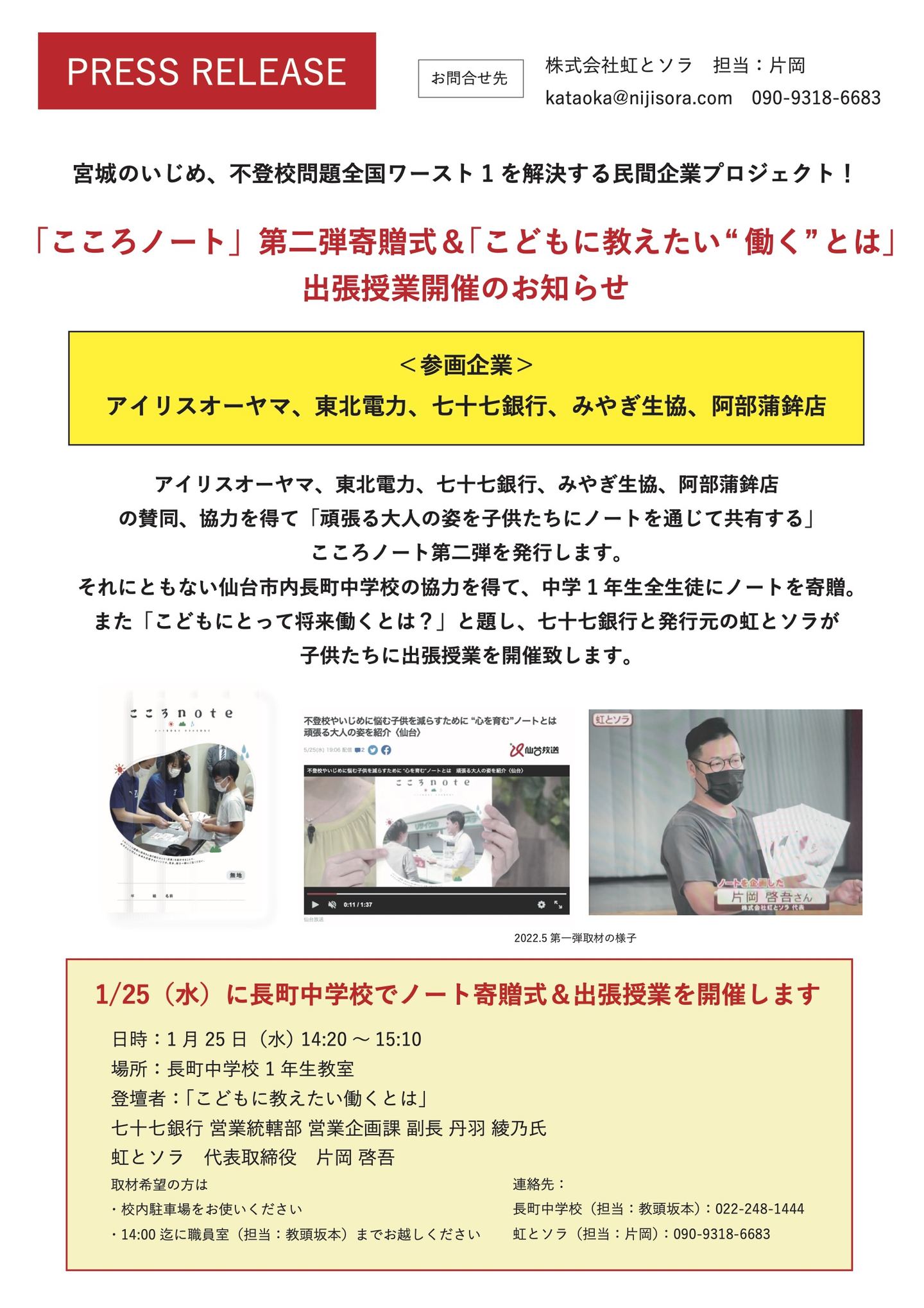 弊社が企画し、アイリスオーヤマ様、東北電力様、七十七銀行様、みやぎ生協様、阿部蒲鉾店様にご協力いただきました、宮城のいじめ、不登校ワースト1の解決を目指す「こころノート」を長町中学校様に寄贈して参りました。当日は七十七銀行様にも登壇いただき、弊社と合わせ2社の思う「将来働くとは?」に関して授業をさせていただきました。ミヤギテレビ様にも取材いただき感謝です。