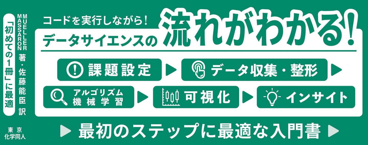 課題設定からデータ収集・整形,機械学習による分析,可視化まで.コードを実行しながら一通り学べる入門書.最初のステップに最適. J.P.Mueller 著