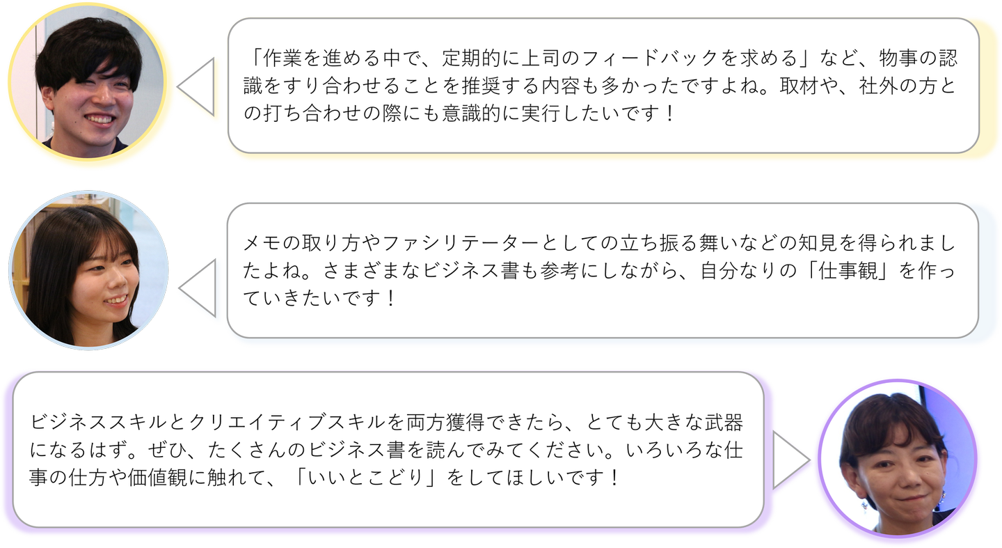課題図書のディスカッションを通して感じた業務効率の改善にも努めつつ、編集ライターとしてよりよい仕事ができるようにしていきたいです。