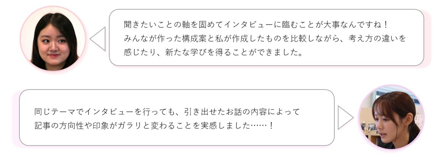 社長からの講評では、インタビューを行う際のポイントとして「相手の話に興味を持って、話のポイントを意識しながら聞く」「記事の内容の軸を事前に決めておく」といったスキルアップに直結するアドバイスもいただきました。