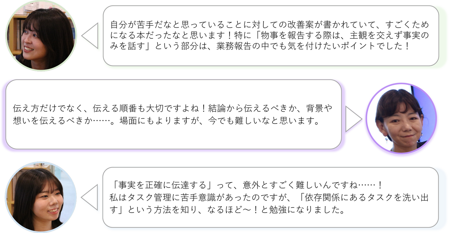 ディスカッションを終えて、新卒側からは「本を読んで終わりではなく、みんなでディスカッションすることで新たな視点を得られた」という感想が多く出ました。