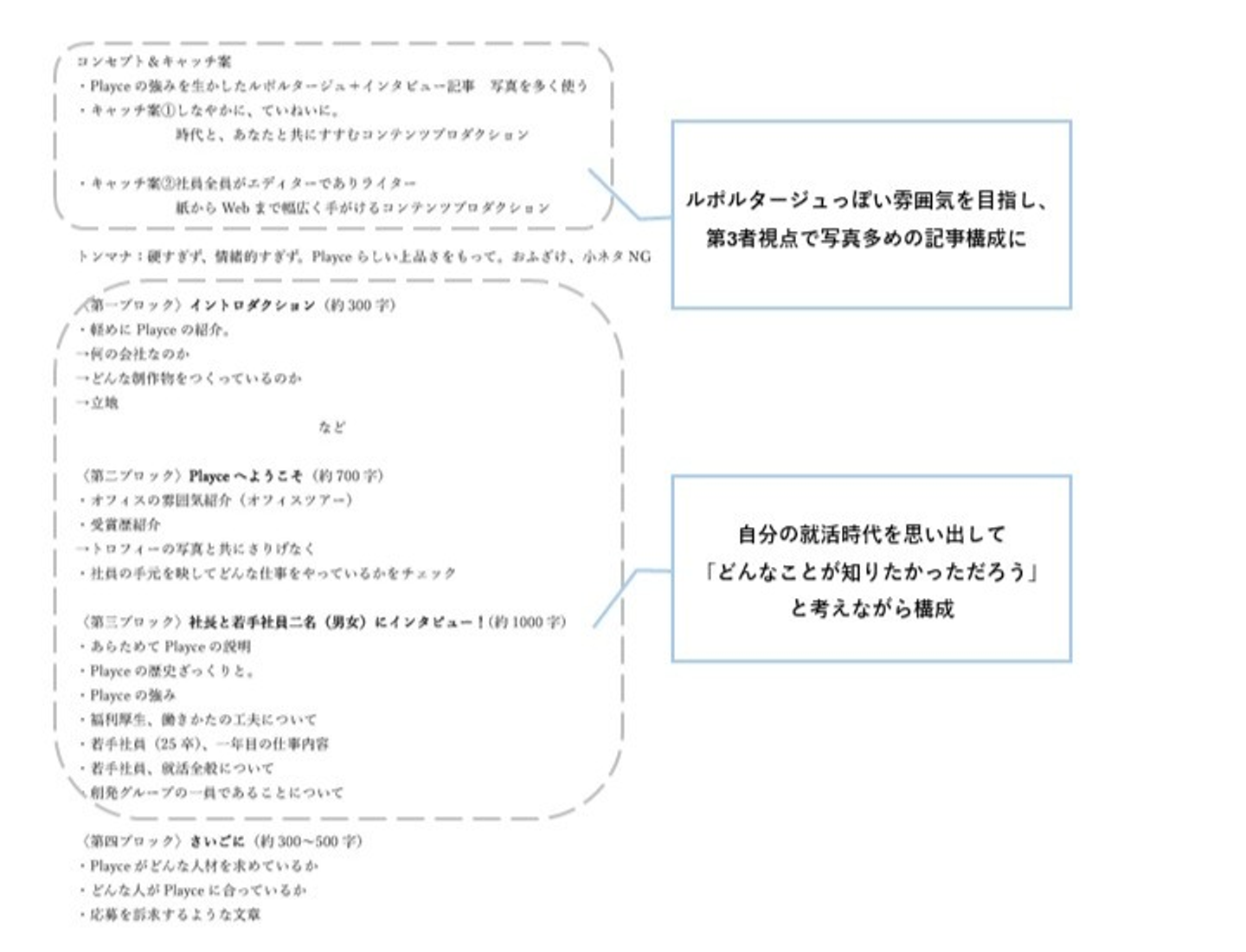 振り返り会で最初に行われたのは、「Playceの会社紹介記事」をテーマにして構成案を作成し、発表するというものです。ライティング研修で学んだ知識をもとに、新入社員たちは初めて構成案作りに挑みました!