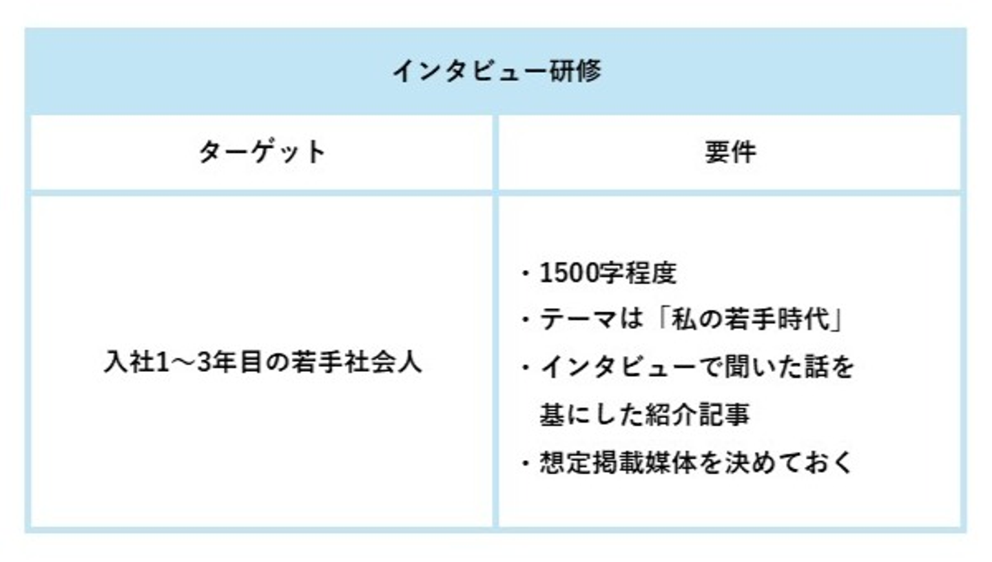 続いては、インタビュー研修の課題発表を行いました。事前にインタビュー研修として、先輩社員に「若手時代」をテーマに取材を実施。その内容をもとに、どのような記事構成にするか、どのような媒体に掲載するかといった企画案を作って発表するというものです。