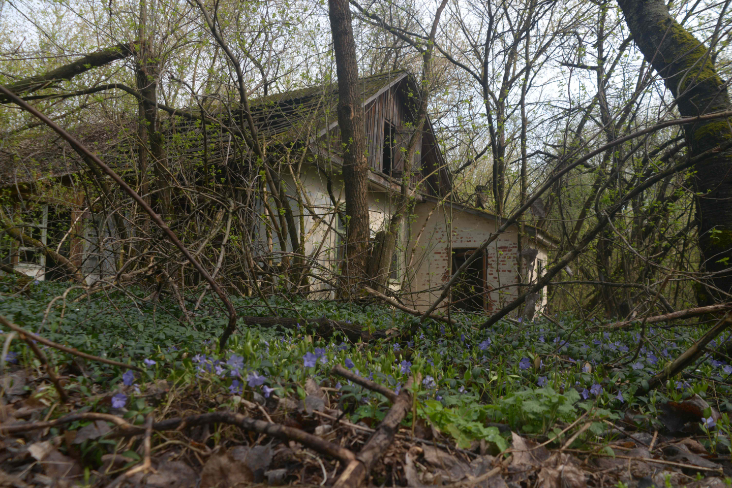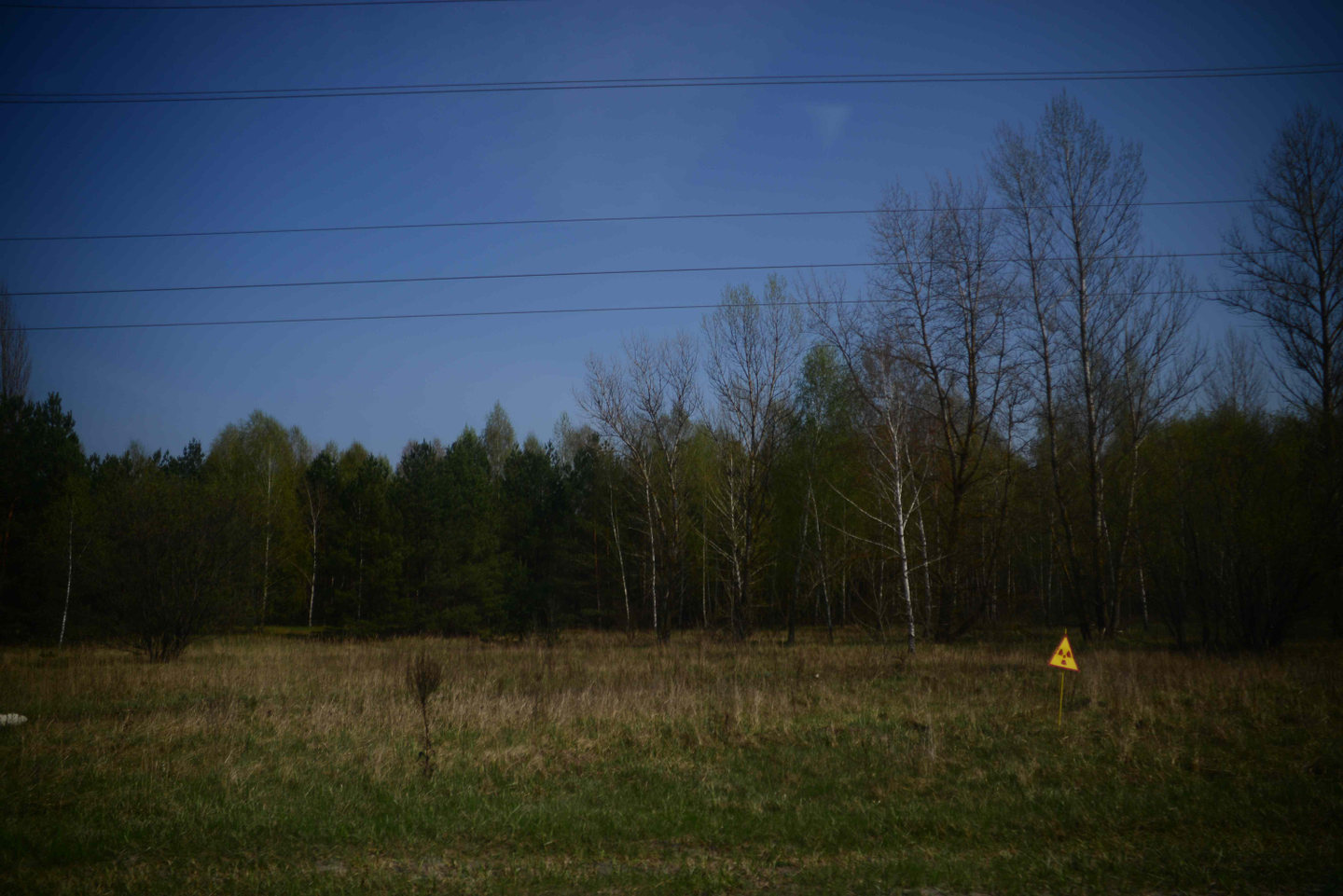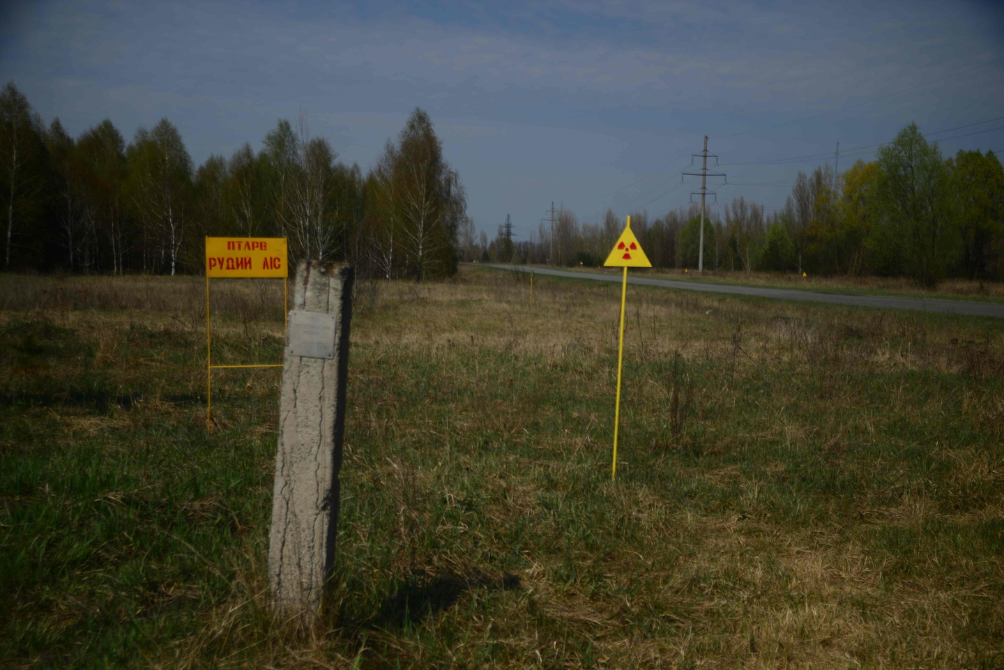 チェルノブイリ原発事故の影響で廃村になった村の跡。ホットスポットを示す標識が立っている。検問所を2回通過しゾーンの中心部チェルノブイリ発電所へ向かう。
