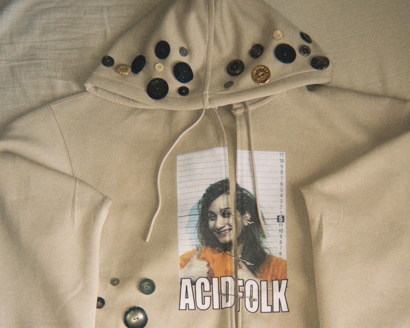 ↑ボタンもたくさん付けて、チャックも全部外して安全ピンを代わりにつけたパンクなパーカー