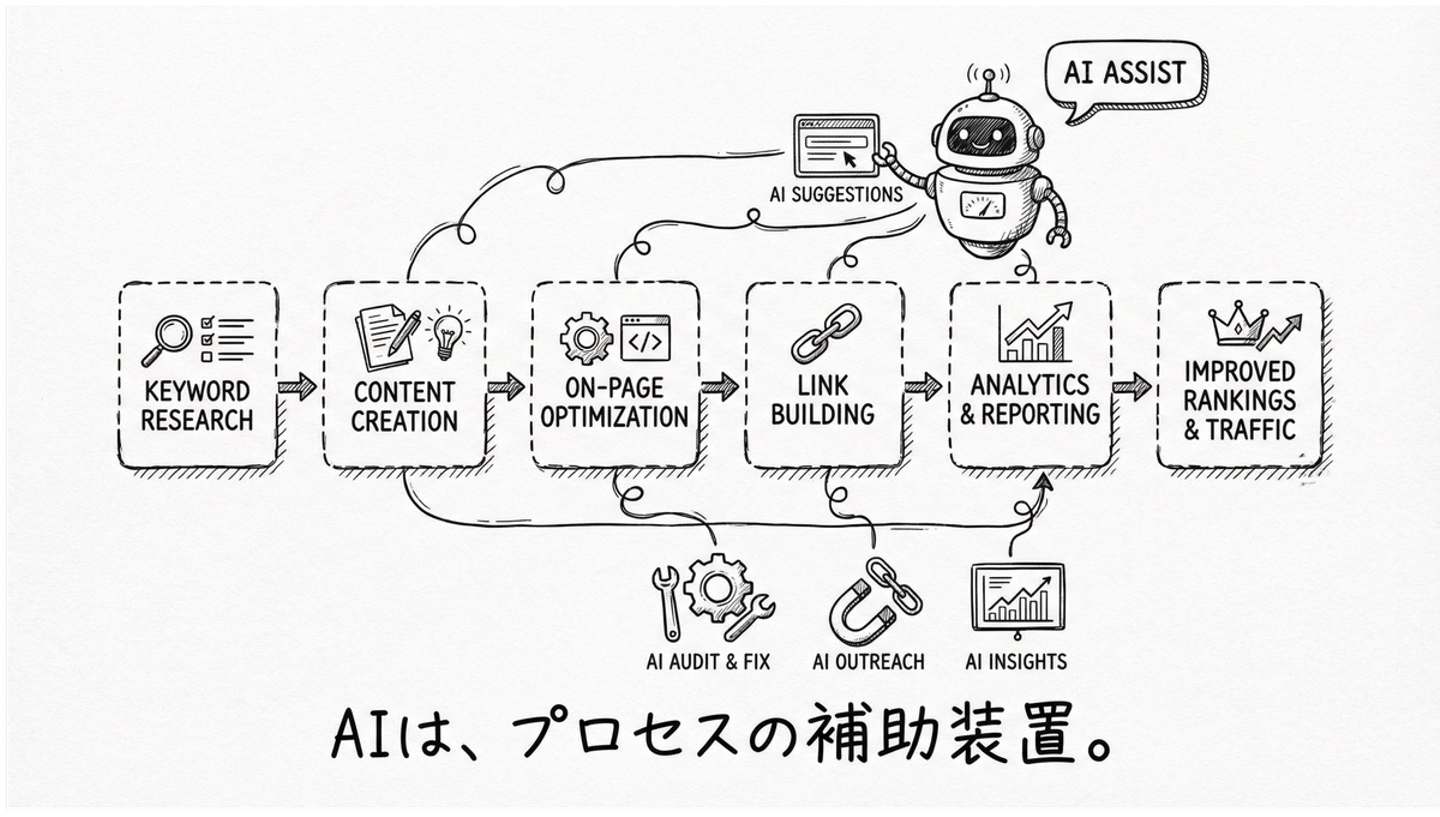AIが「文章生成ツール」ではなく、SEOプロセスの補助装置になっている点です。