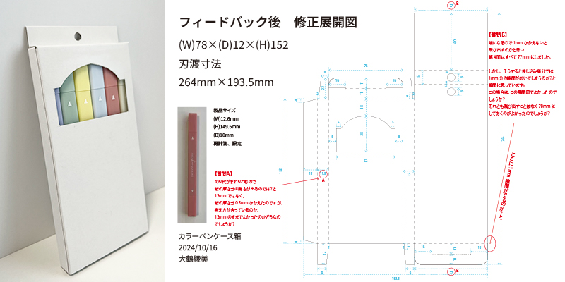 オンライン授業とは思えないほど手を動かす時間が多く、毎回課題が出されるため常に頭をフル回転させていました。入れたい製品を採寸し、Illustratorで図面を引いて、ボール紙を切り組み立て、先生に送り講評をしていただく。仕事と並行しながら取り組むのは大変でしたが、その分確実に力がついていくのを感じられました。