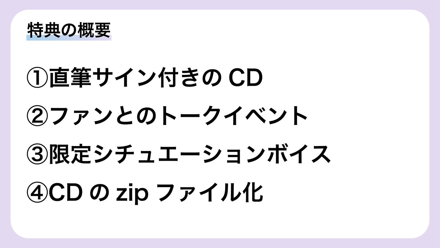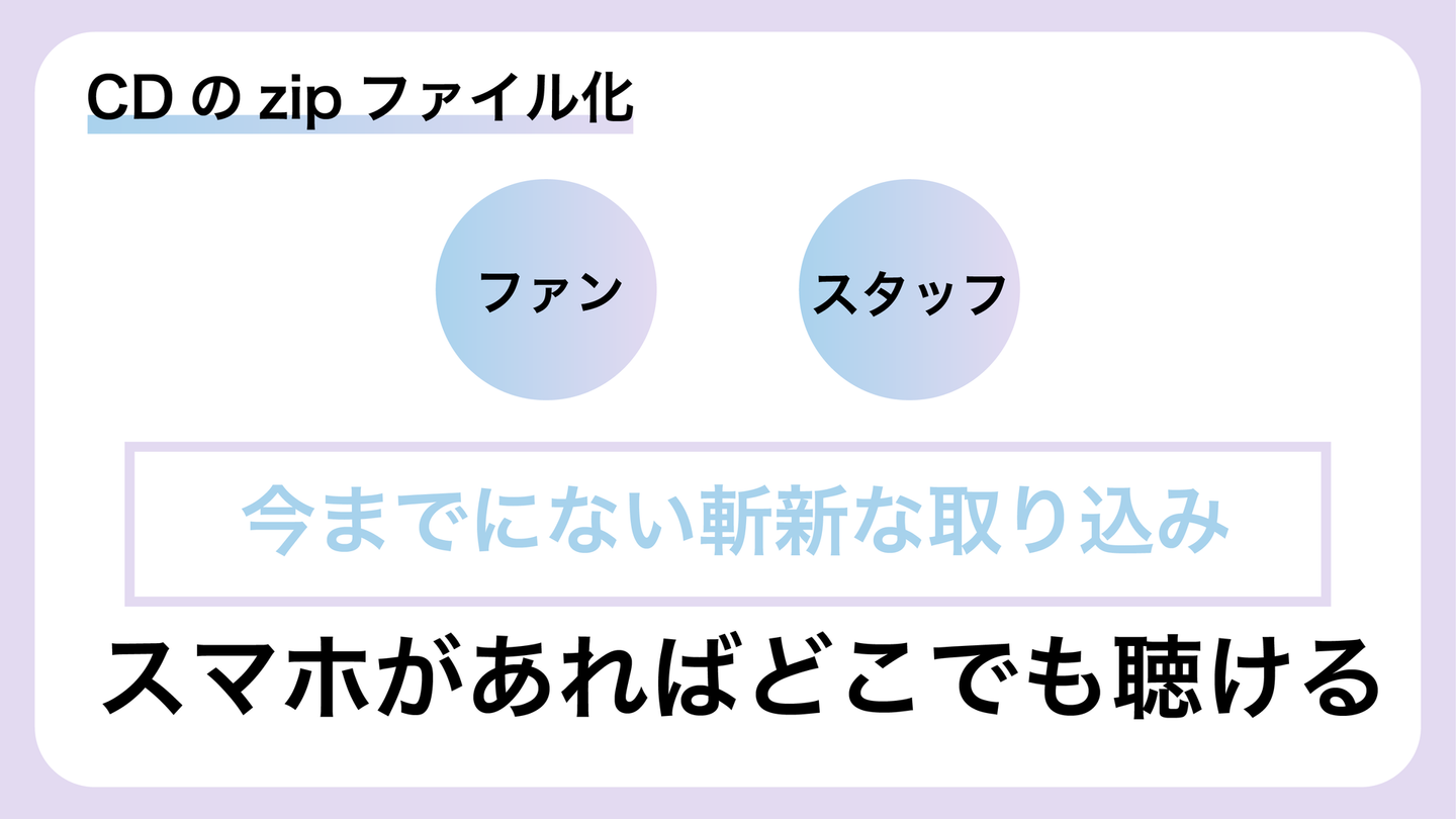 そもそもCDとは音楽を聴くものだと感じでいたので、CDのパッケージ特典の中に「zipファイル」としてダウンロードできるようのものを提案しました。