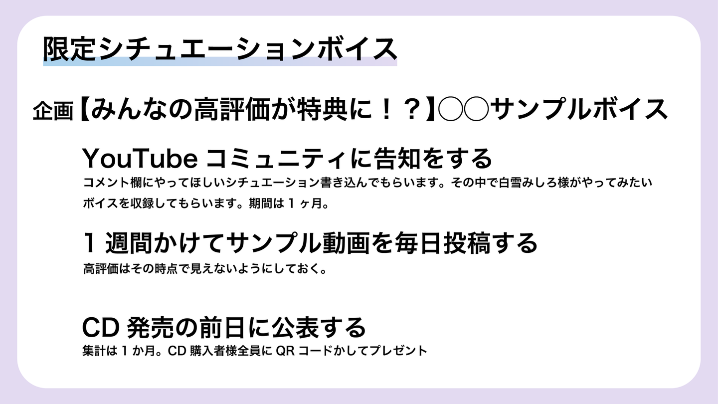 このような手法を大手のVTuberの方の1人も行っておりかなり反響がよく視聴者を巻き込んだ企画はCDを購買欲を掻き立たせる企画を提案しました。