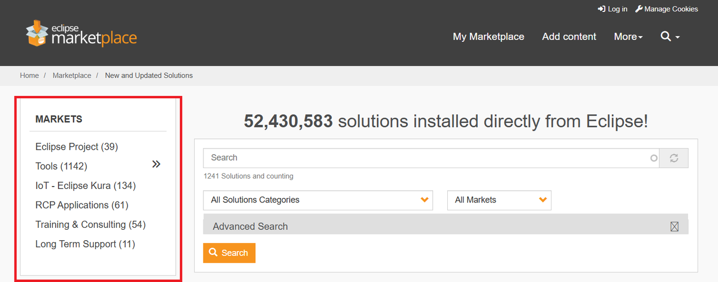 Eclipse マーケットプレースでいうと、以下の赤枠の部分が「ファセット検索なのでは?」と思い実際に絞り込みを行ったところ、ブラウザではうまく動作することがわかりました。
